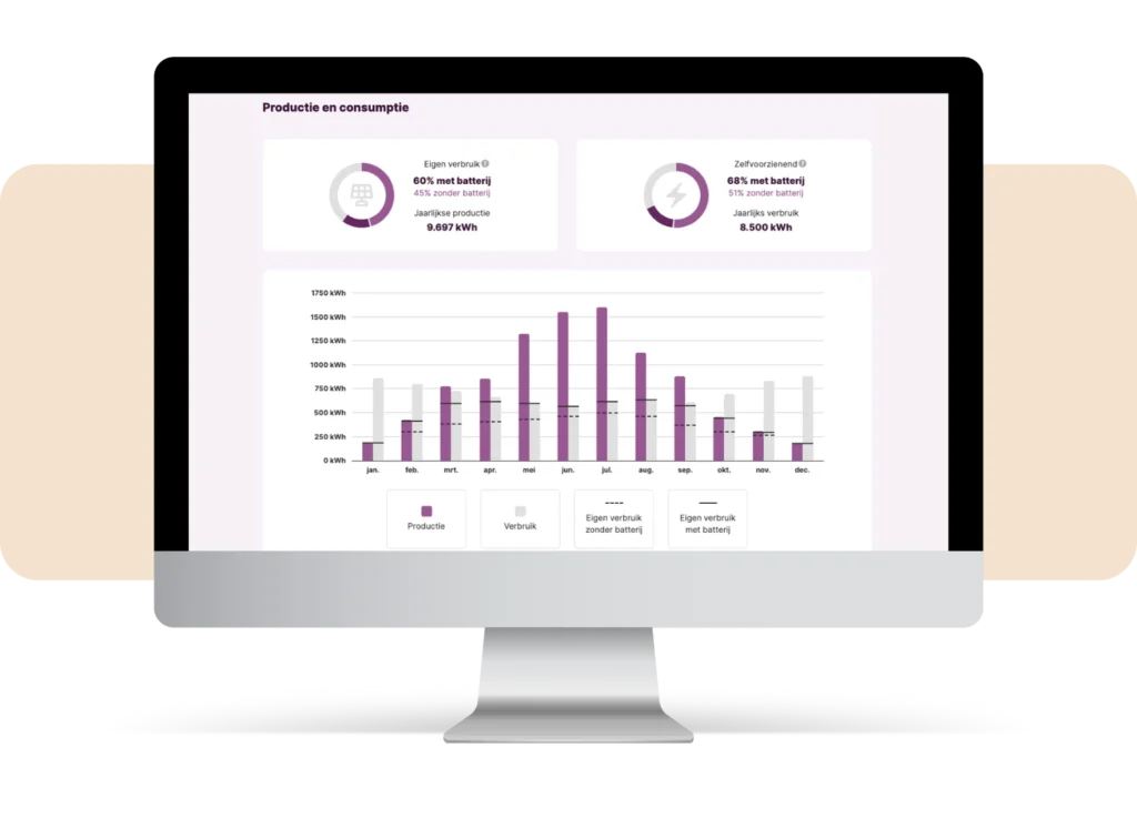 - De software berekent automatisch het aandeel zelfverbruik zonder batterij én met batterij.