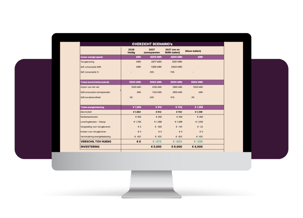 (*) We gaan er dan wel van uit dat er na het afschaffen van het salderen in 2027 geen teruglevertarieven meer zijn. Dat is onzeker. Maar wanneer Sarah over gaat op een dynamisch tarief zijn er sowieso geen terugleverboetes meer. En dat gaan we straks met de batterij voorstellen.