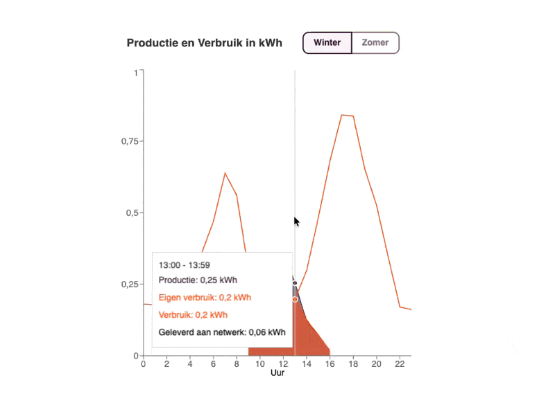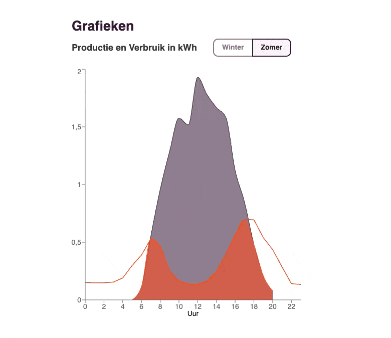 - Productie en consumptiedata per uur – we simuleren hoe de batterij daadwerkelijk wordt gebruikt gedurende het jaar en nemen daarin ook seizoensinvloeden mee.
