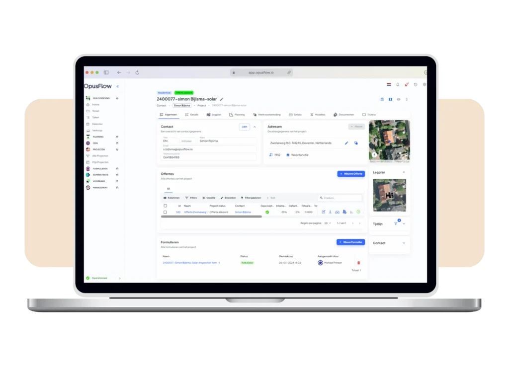 Opus Flow is een CRM- en workflowsoftware gericht op zonne-energie en installatiebedrijven. De software is zeer vergelijkbaar met Sollit, maar voelt wat moderner en gebruiksvriendelijker. Tegelijkertijd is de software nog redelijk nieuw en dat uit zich in veel ervaringen over enigszins buggy software. De CRM en ERP functionaliteiten, met name de automatiseringen, zijn wat beter dan Sollit. De calculatie-tooling is helaas echt ondermaats en het gebrek aan integratie met Solar Monkey is een gemiste kans.